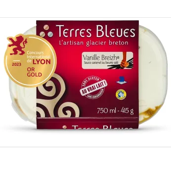 Terres Bleues, artisan glacier fabricant, installé en Bretagne depuis 20 ans, propose des glaces et crèmes glacées premium et des sorbets "plein fruit". Les matières premières et ingrédients aromatiques sont sélectionnés en local, en région et en France prioritairement. Le lait frais provient de fermes voisines (situées à moins de 3km de l'atelier) et les fruits proviennent d'une fruitière locale (située à 30 km de l'atelier). L'établissement est agréé Glaces et Sorbets de Tradition Française par la CNGF (Confédération Nationale des Glaciers de France) et adhère au Collège Culinaire de France (CCF). Les glaces sont proposées en bacs familiaux et pots individuels distribuées en GMS alimentaires en région Bretagne, et en formats professionnels et individuels pour tous les Métiers de Bouche.